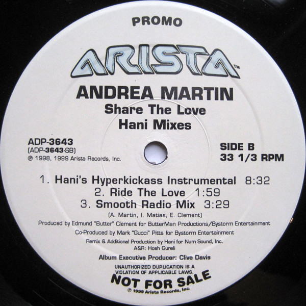 A1 Share The Love (Hani’s Hyperkickass Mix)8:31A2 Share The Love (Hyper Radio Mix)3:48B1 Share The Love (Hani’s Hyperkickass Instrumental)8:32B2 Share The Love (Ride The Love)1:59B3 Share The Love (Smooth Radio Mix)3:29