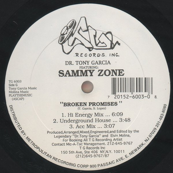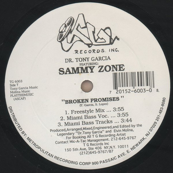 T Side T1 Broken Promises (Freestyle Mix)3:55T2 Broken Promises (Miami Bass Voc.)3:55T3 Broken Promises (Miami Bass Tracks)3:44 G Side G1 Broken Promises (Hi Energy Mix)6:09G2 Broken Promises (Underground House)3:48G3 Broken Promises (Acc Mix)3:07